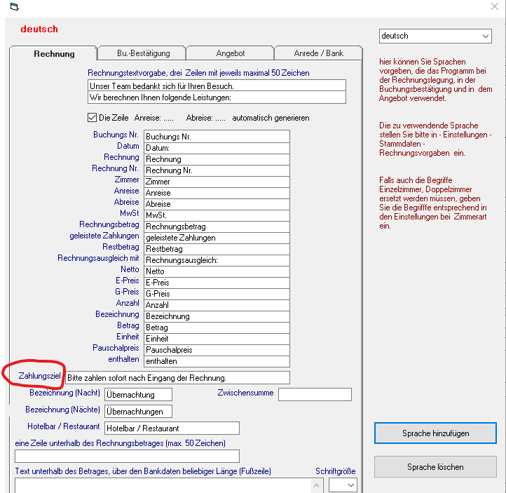 Die Vorgaben für den Text des Zahlungsziels werden in Einstellungen – Stammdaten – Rechnungsvorgaben – „Sprachen einrichten / Textvorgaben“ hinterlegt: